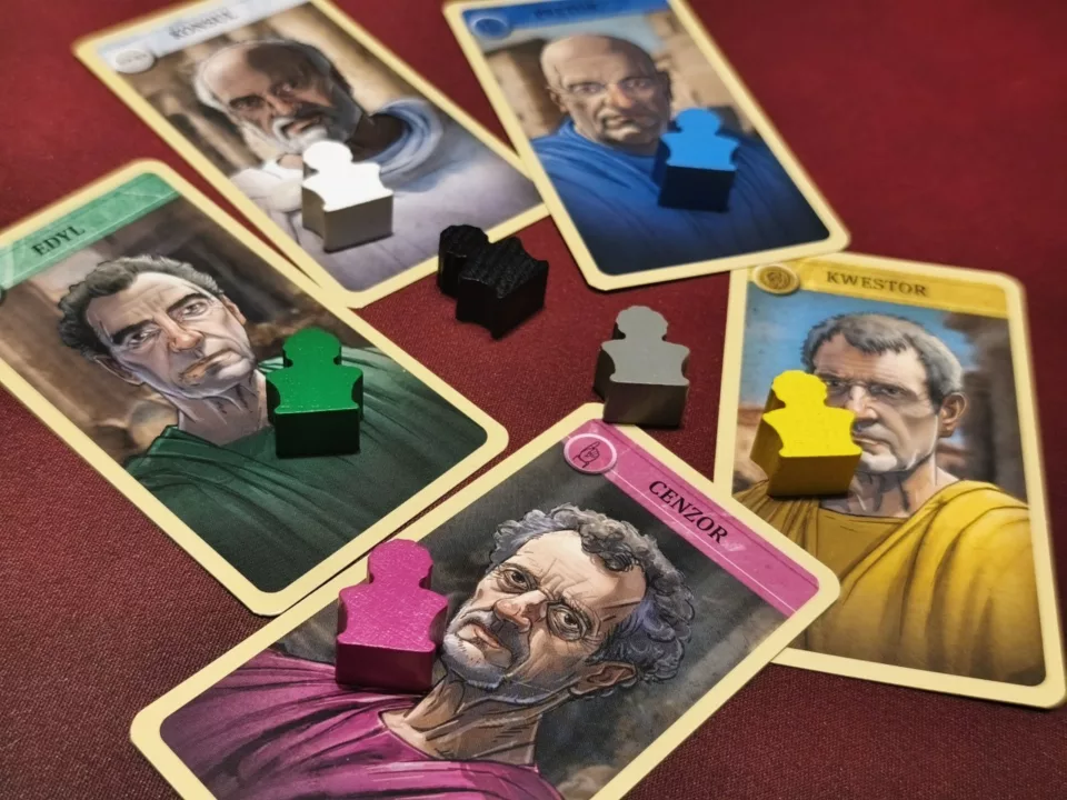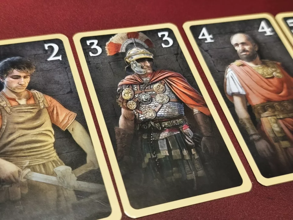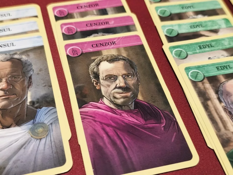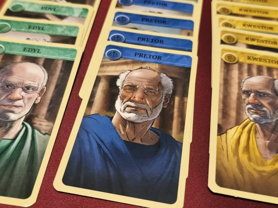 Trochę już wiadomo gdzie „leży pies pogrzebany” i w jakich rejestrach można umieścić ten tytuł. Przede wszystkim będzie zależeć nam, żeby przechytrzyć przeciwnika, a mamy na to kilka możliwości. Na początku gry przydzielamy zakryte karty o wartościach od 1 do 5 do poszczególnych stosów patrycjuszy. To pierwsza niewiadoma dla przeciwnika, z którą należy się zmierzyć. Prawdopodobnie pozycja zagranych kart będzie skorelowana z dobranymi tajnymi Misjami, ale niekoniecznie. Następnie naprzemiennie zagrywamy kolejne karty – jedną jawną, jedną zakrytą. Przed lub po akcji głównej można dograć kartę akcji, jako ruch opcjonalny. Gracz następnie losuje z worka (poza pierwszą turą) znacznik popiersia i następuje porównanie sił wśród zagranych kart w odpowiednim kolorze.