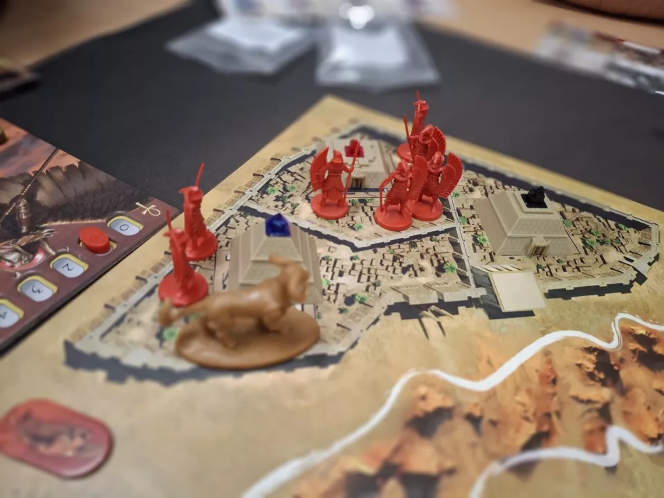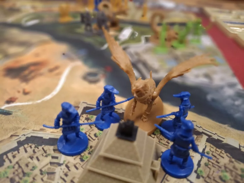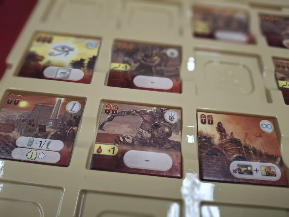 • wykonanie – figurki mitologicznych potworów (sfinks, ogromny skorpion, mumia) robią wrażenie na stole, ale to nie tylko ozdobniki, realnie wpływają na rozgrywkę. Grafika jest ładna, a plansza nawet bardzo urokliwa, doskonale oddaje klimat pustynnego Egiptu. Karty i kartonowa konfekcja również na wysokim poziomie, pod względem zawartości wiemy, za co płacimy (plus całkiem sensowny insert).