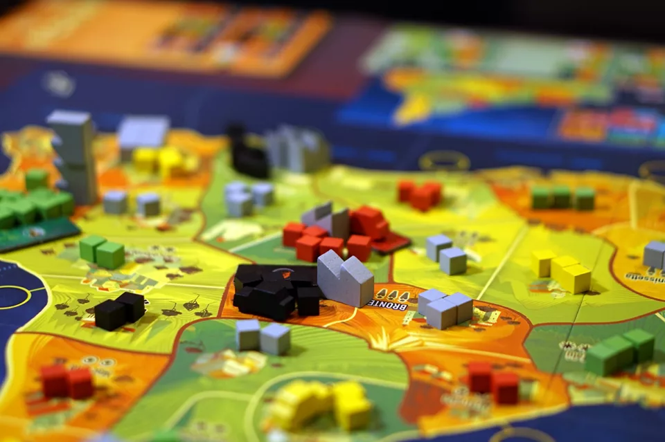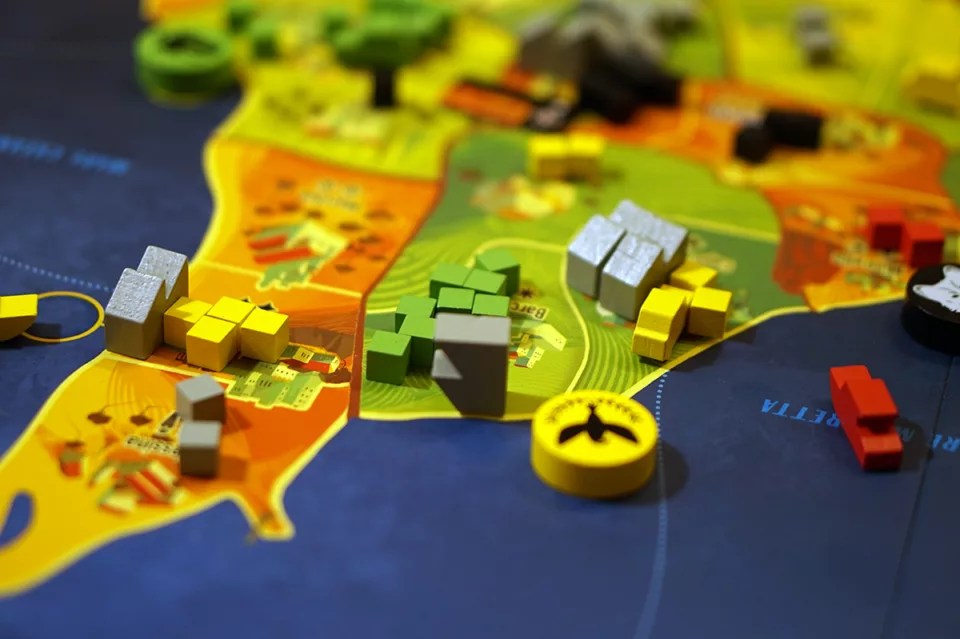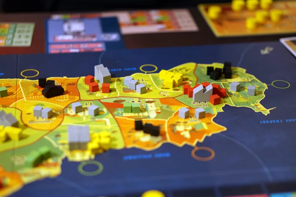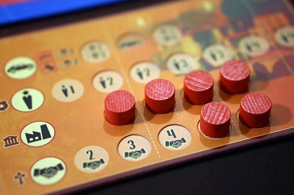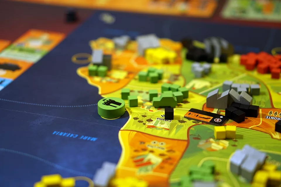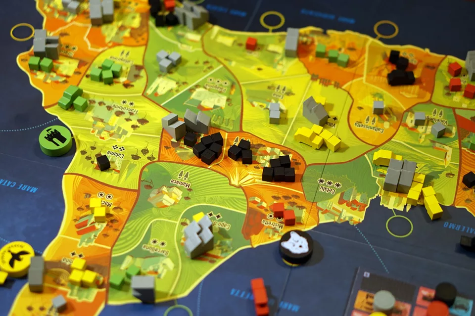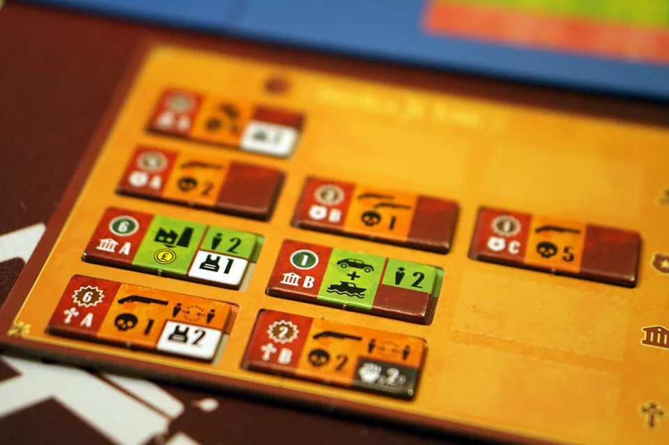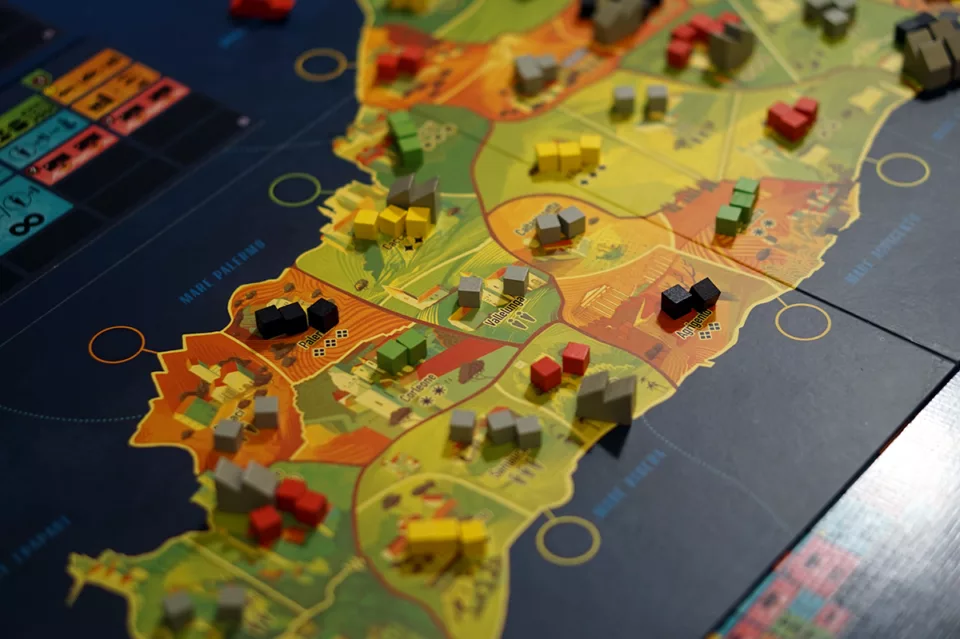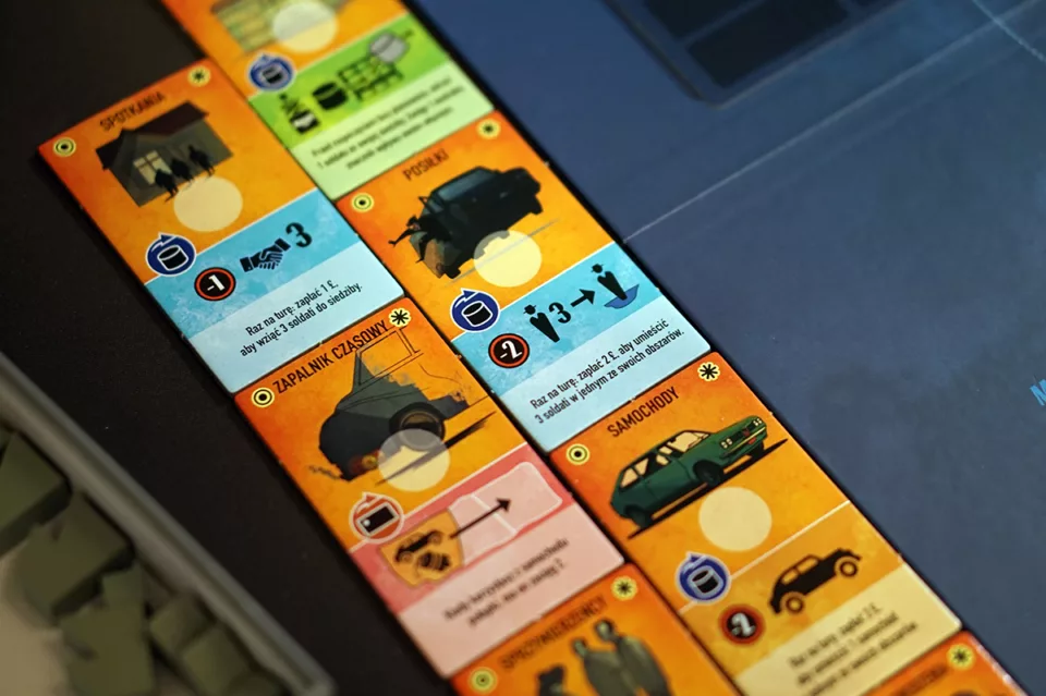 Reszta elementów jest dobrej jakości — dostajemy dużo drewienka: kosteczek – Soldato, laboratoriów, czy walców do oznaczania akcji i blokowania nieodsłoniętych jeszcze poziomów torów wpływów; trochę kart, które głównie leżą na stole, więc nie ma sensu ich koszulkowania. Planszetki graczy są dwustronne. Fajną rzeczą jest to, że na drugiej stronie planszy jest olbrzymia ilustracja – taka sama jak na wieku pudełka – bardzo przyjemna dla oka.