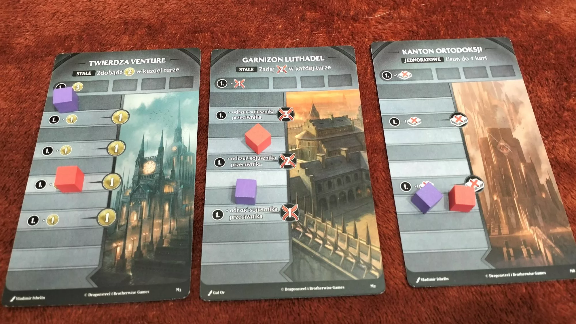 Po drugie – fiolki. Ok, to jest trochę część punktu pierwszego, ale chodzi o sam motyw używania jednych kart jako zasobu do aktywacji drugich. Na początku nie byłem do tego przekonany, ale w praktyce działa wyśmienicie. Zwiększa zarówno móżdżenie w trakcie zagrywania jak i kupowania kart, oraz sprawia, że nawet pozornie słabe karty mogą mieć dużą wartość.