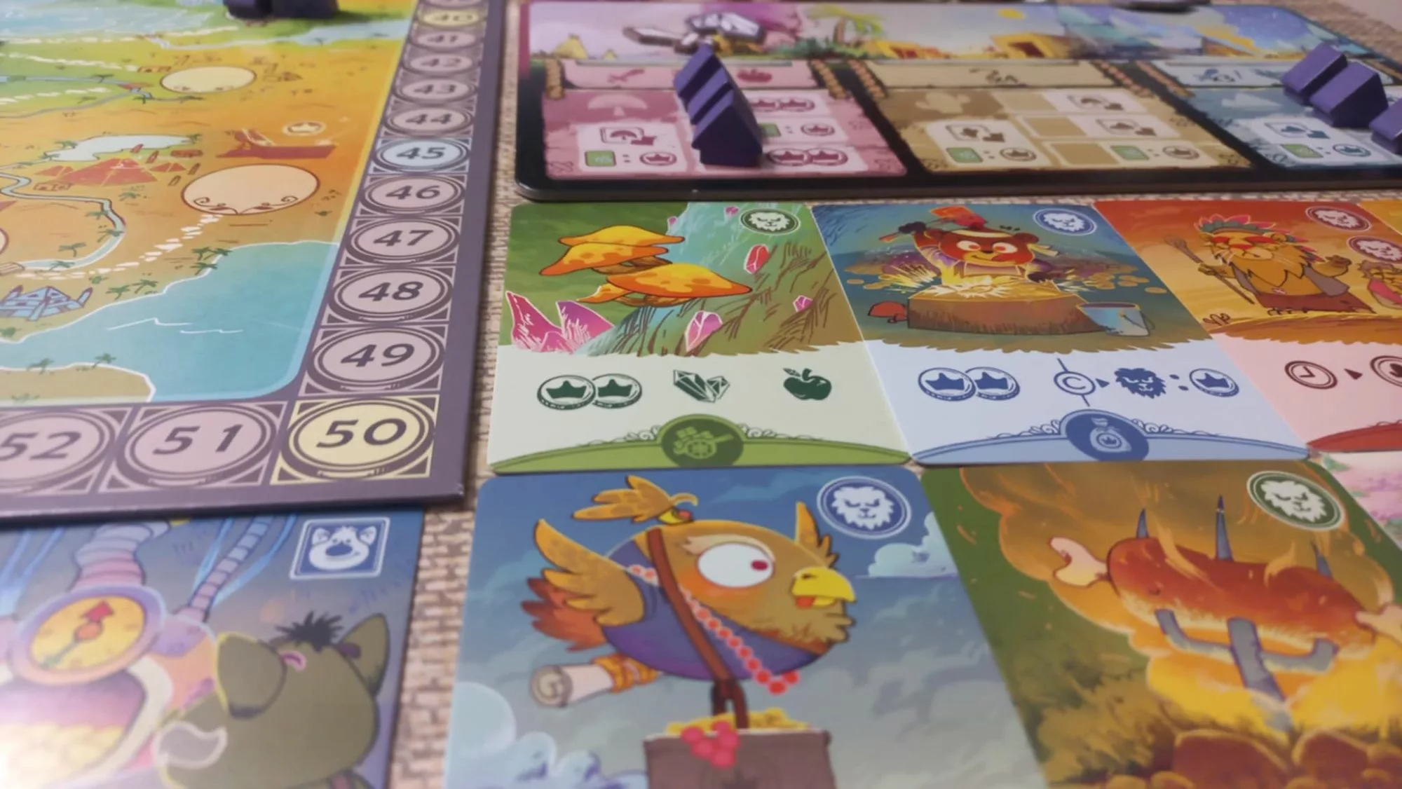 A tej grafiki nie dość, że jest dużo, to jest na naprawdę wysokim poziomie. Mamy tutaj unikatowe ilustracje na kartach, czytelne ikony, pełną detali planszę oraz garści różnych tokenów i innych znaczników. Na moje oko styl przypomina dzieła Kyle’a Ferrina, zwłaszcza te z Oath, co już jest komplementem samym w sobie. Nie brak jednak indywidualności temu projektowi, z tego co wiem, Meng Chunulin zajmuje się też rysowaniem komiksów i widać to w jego ilustracjach – dużo w nich akcji, charakternych postaci i ciekawych miejsc, zresztą zobaczcie sami.