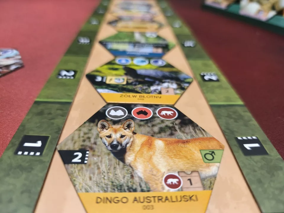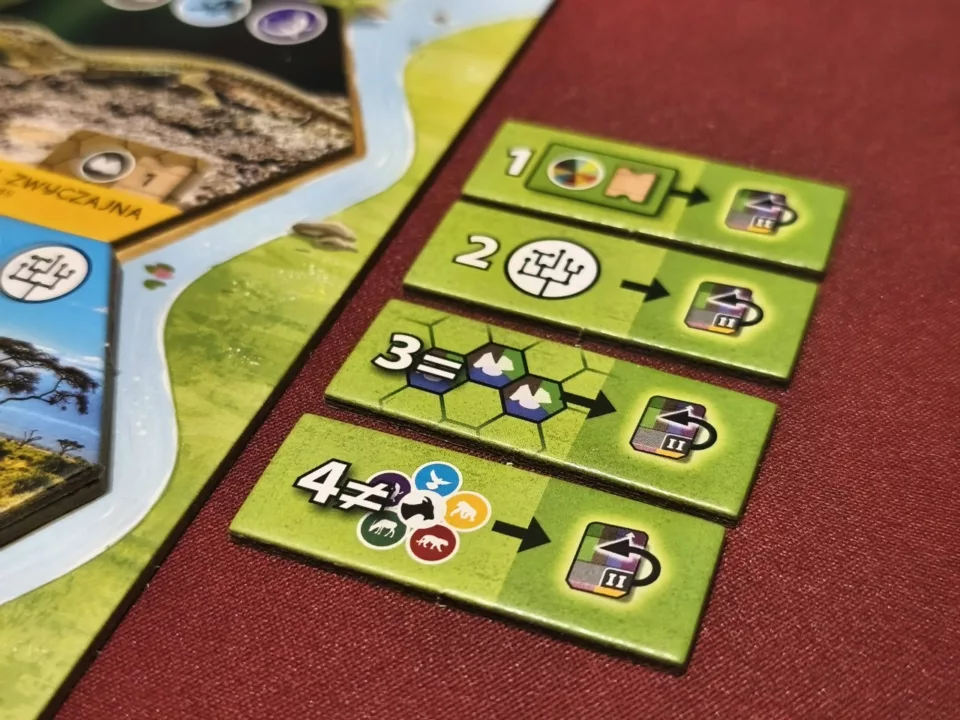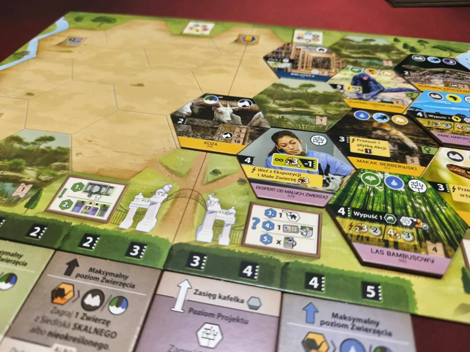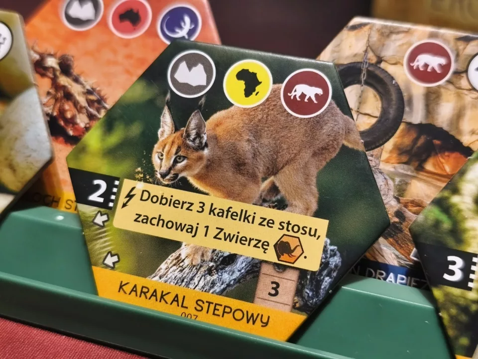 Z planszy Ekspozycji będziemy mogli, a nawet musieli, dobierać kafelki na swoją rękę, przygotowano do tego specjalne podstawki. Wypatrywać tam będziemy w szczególności zwierząt, ale pojawią się też projekty i budynki – tylko trzy rodzaje kafelków. A na nich kilka istotnych informacji. Poza zdjęciem i jego opisem, które choć atrakcyjne, stanowi tylko tło dla ważnych w trakcie rozgrywki ikon. W górnej części znajdziemy informacje z jakim typem kafelka mamy do czynienia, a jeśli jest to zwierzę, do jakiej kategorii jest zaliczane: drapieżnicy, roślinożercy, naczelne, ptaki, gady, zwierzęta mini zoo. W większości przypadków dopatrzymy się również oznaczeń jednego z pięciu kontynentów, a także tak zwanych siedlisk, naturalnych terenów, dla występowania konkretnych gatunków zwierząt: woda, las, skały lub siedliska “nieokreślone”. Co ciekawe przeprowadzenie akcji będzie w głównej mierze opierać się właśnie na typach siedlisk. To one będą szczególnym wyznacznikiem wykonania ruchu. Drugim aspektem branym pod uwagę będzie wartość kafelka wyrażona siłą akcji, powiązana także z wielkością zwierzęcia – 2/3 małe, 4/5 duże zwierzęta. Na kafelkach budynków pojawią się szczególne wymogi ograniczające zagranie ich do naszego ogrodu – budynki nie będą umieszczane w ramach akcji głównej.