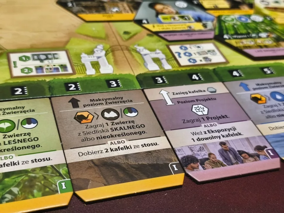 Pewne uproszczenie w stosunku do starszej siostry odnajdujemy również w sposobie zagrywania akcji. Zachowano oryginalny mechanizm rotowania kart akcji, gdzie po skorzystaniu z efektu karty, zmieniamy jej pozycję, tym samym niejako resetując dostępną siłę przeprowadzenia akcji, wzmacniając z kolei potencjał pozostałych kart. Dysponujemy czterema kartami, jedna pozwalająca wystawić kafelek projektu, jednocześnie jest wyznacznikiem zasięgu na torze Ekspozycji, pozostałe służą do zagrania kafelków zwierząt pod względem rodzaju siedliska, do którego są przypisane. W przypadku niemożliwości przeprowadzenia pełnej akcji, zawsze zostaje opcja dociągu dwóch kafelków ze stosu dobierania lub jednego z ekspozycji, to również w ramach zagrania jednej z kart akcji. Karty akcji podobnie jak w pierwowzorze są dwustronne. Mamy możliwość awansowania karty na drugi poziom, po spełnieniu jednego z czterech osiągnięć: wsparcie co najmniej jednego celu Ochrony Przyrody, posiadanie w zoo przynajmniej dwóch Projektów, połączenie minimum trzech kafelków tego samego siedliska, posiadanie w zoo ikon czterech różnych zwierząt. Wymagania spełnia się niejako przy okazji, choć warto zwrócić na to uwagę przy zarządzaniu i budowaniu zoo. To, co przynoszą nam ulepszone karty, to przede wszystkim wskaźnik siły dostępnej akcji zwiększa się, co pozwala nam nieco wcześniej zagrywać konkretne kafelki, a przy najbardziej zaawansowanej akcji nawet te o wartości 5.