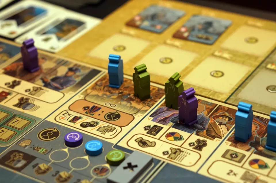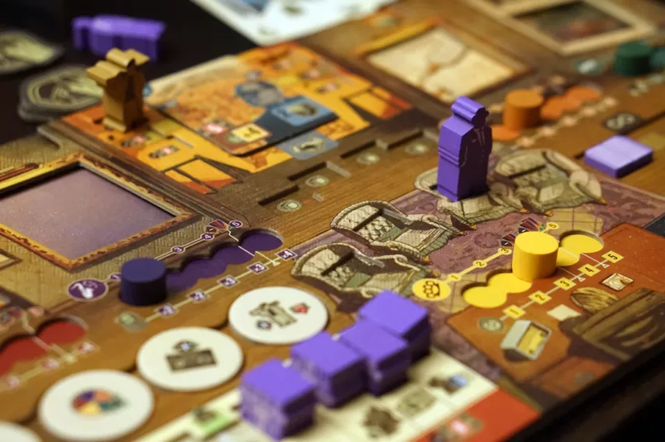 Na szczególną uwagę zasługują dwuwarstwowe planszetki graczy, które poza sekcjami na żetony mają również okienka na karty. Po wsunięciu kartoników ukaże nam się widok z okna lub plakat na ścianie – świetnie zaprojektowana rzecz. A w dodatku, jeżeli mamy mało miejsca (a gra jest olbrzymia), to w przypadkach, gdy planszetki kładziemy obok planszy głównej, wydawca dodał specjalne listwy, które je podnoszę, dzięki czemu wsuwanie kart nie powinno stanowić żadnego problemu.