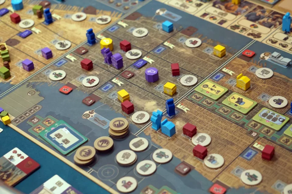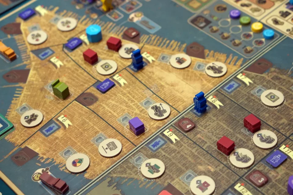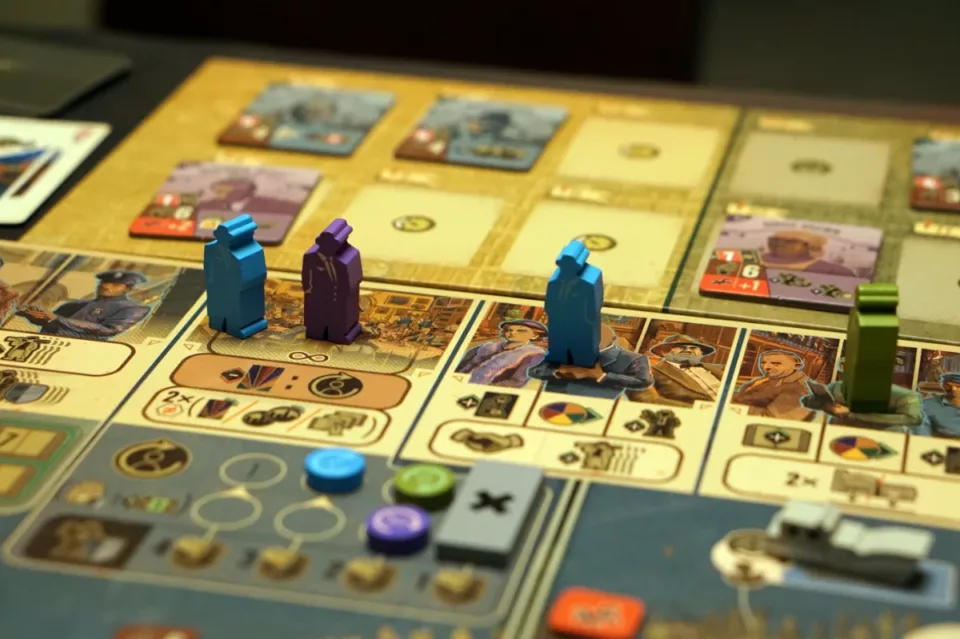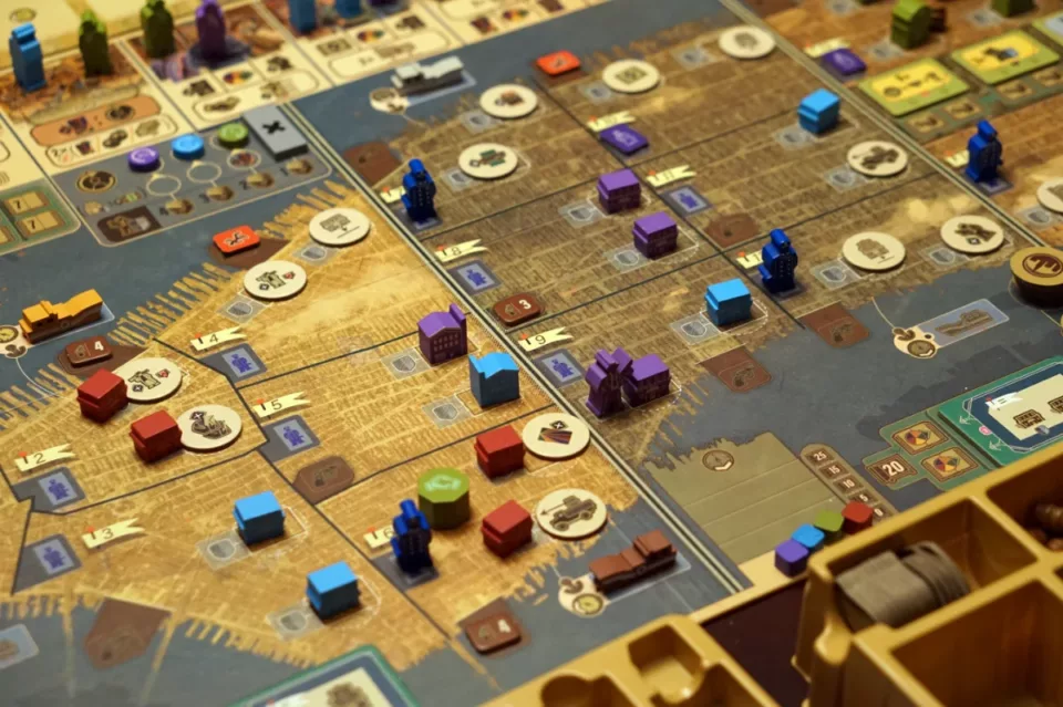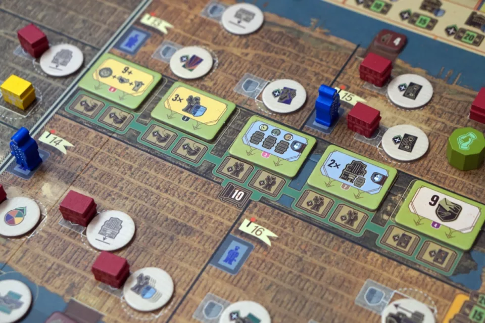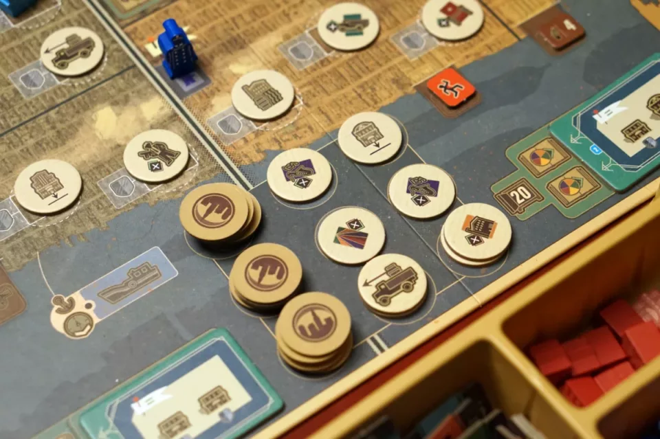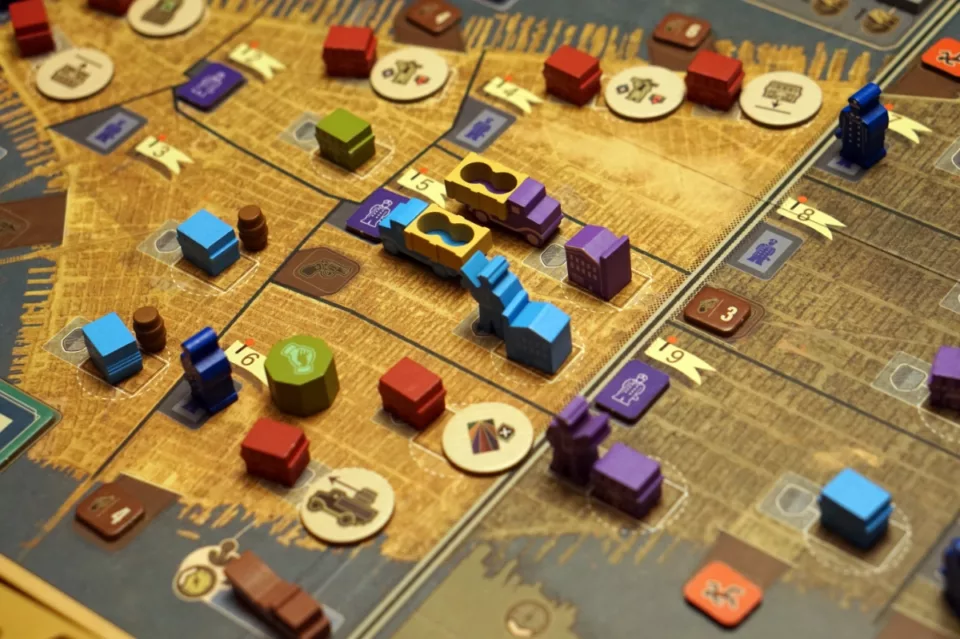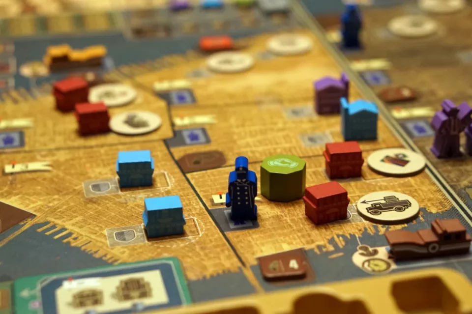 Kluczowa jest rozbudowa naszego imperium. Najlepiej najlepszymi budynkami w jak największej liczbie dzielnic. Za kontrolę (a liczy się rodzaj budynku z ewentualną ochroną, a nie ich liczba) dostajemy pieniądze… dużo pieniędzy. To jest właśnie element area control. W grze nie ma możliwości walki między graczami (poza ew. zajmowaniem najkorzystniejszych pól, jak to w worker placemencie bywa), więc jeżeli jako pierwsi postawimy knajpę w danej dzielnicy, to inny gracz nie będzie w stanie nas stamtąd wykurzyć – no, chyba że zrobi to mafiozo neutralny.
