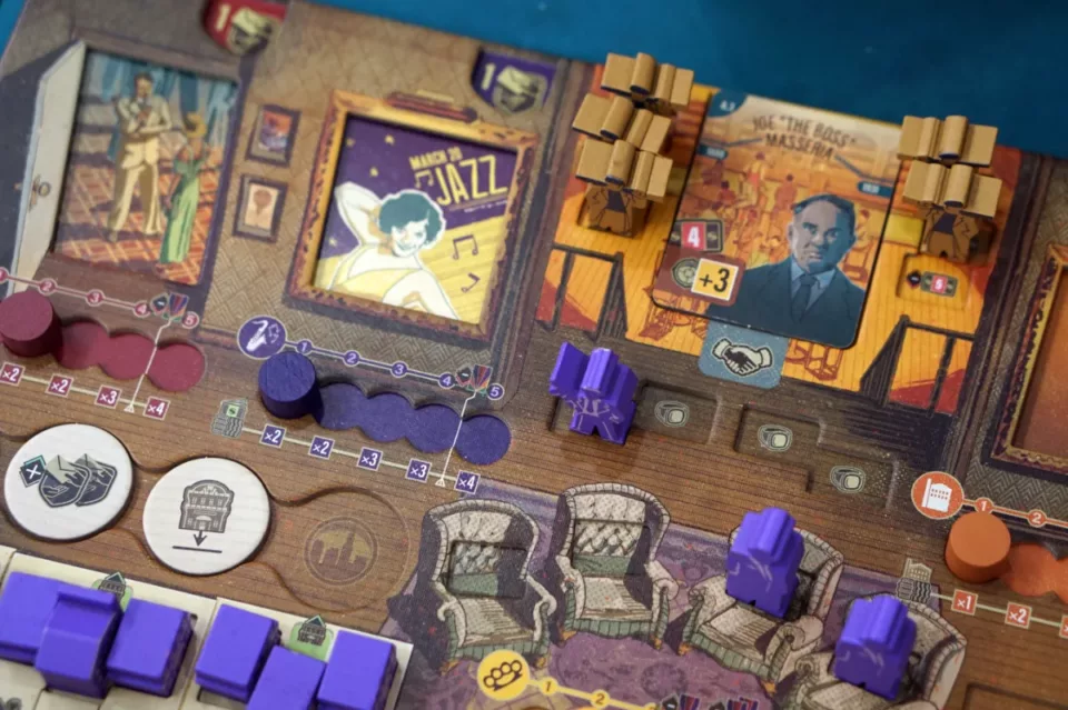 Speakeasy to klasyczny worker placement z elementami area control, chociaż bez wyraźnego konfliktu i walki między graczami. Kluczem do zwycięstwa jest to, by zrozumieć, gdzie i jak zarobimy najwięcej, bo to właśnie kasa odzwierciedla punkty zwycięstwa. Mamy dwa rodzaje gotówki — czystą i brudną. Obie są warte tyle samo, ale jeżeli chcemy wydawać tę drugą (chowaną w sejfie za zasłonką, by inni gracze nie wiedzieli, ile jej mamy), to musimy przeliczać ją w niekorzystnym kursie dwa do jednego, a czasami nie będziemy mieli wyboru. Różny rodzaj gotówki zarabiamy w różnych miejscach — np. legalną kasę zgarniamy z barów, a nielegalną od szefa Komisji: Luckiego Lucianego — za kontrolę dzielnic czy realizacje celów.